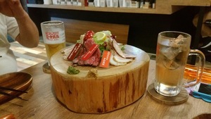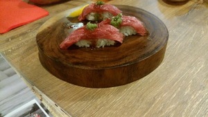 肉専用居酒屋、ミートバルで、十勝牛の握りにローストビーフ、ポーク、チキンの盛り合わせ![]()