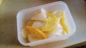 かぶを薄切りにして、レモン、オリーブオイル、昆布茶、砂糖、塩を入れて軽くもみ、