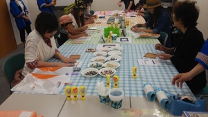 モザイクタイルで写真立てやコースター作りを楽しんでもらいました